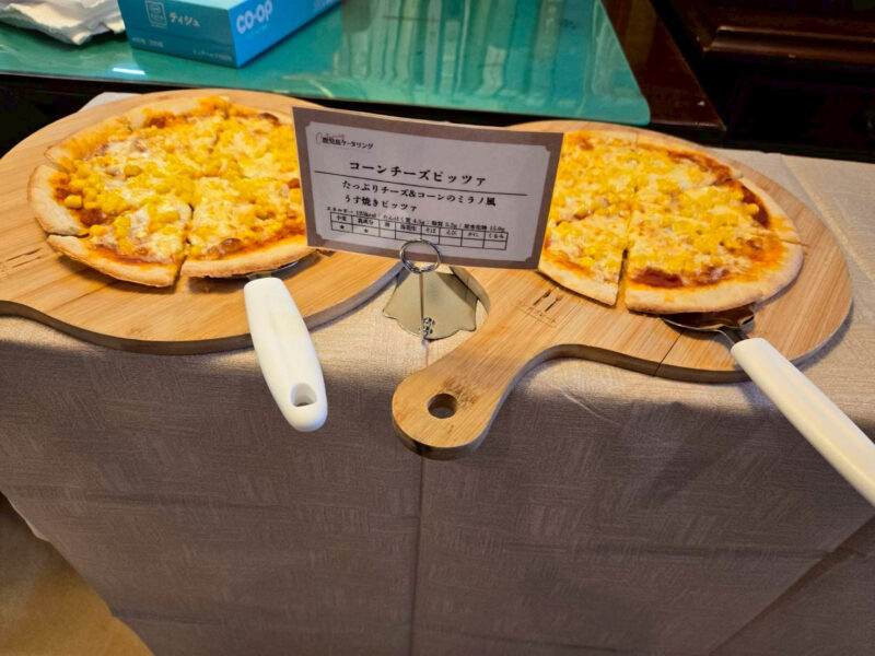 コーンチーズピッツァを並べると、香ばしい匂いがふわっと広がって、一気にパーティーの主役が躍り出たような華やかさに。前菜のカルパッチョやピンチョスも、新年の光を浴びてキラキラと輝いていました。